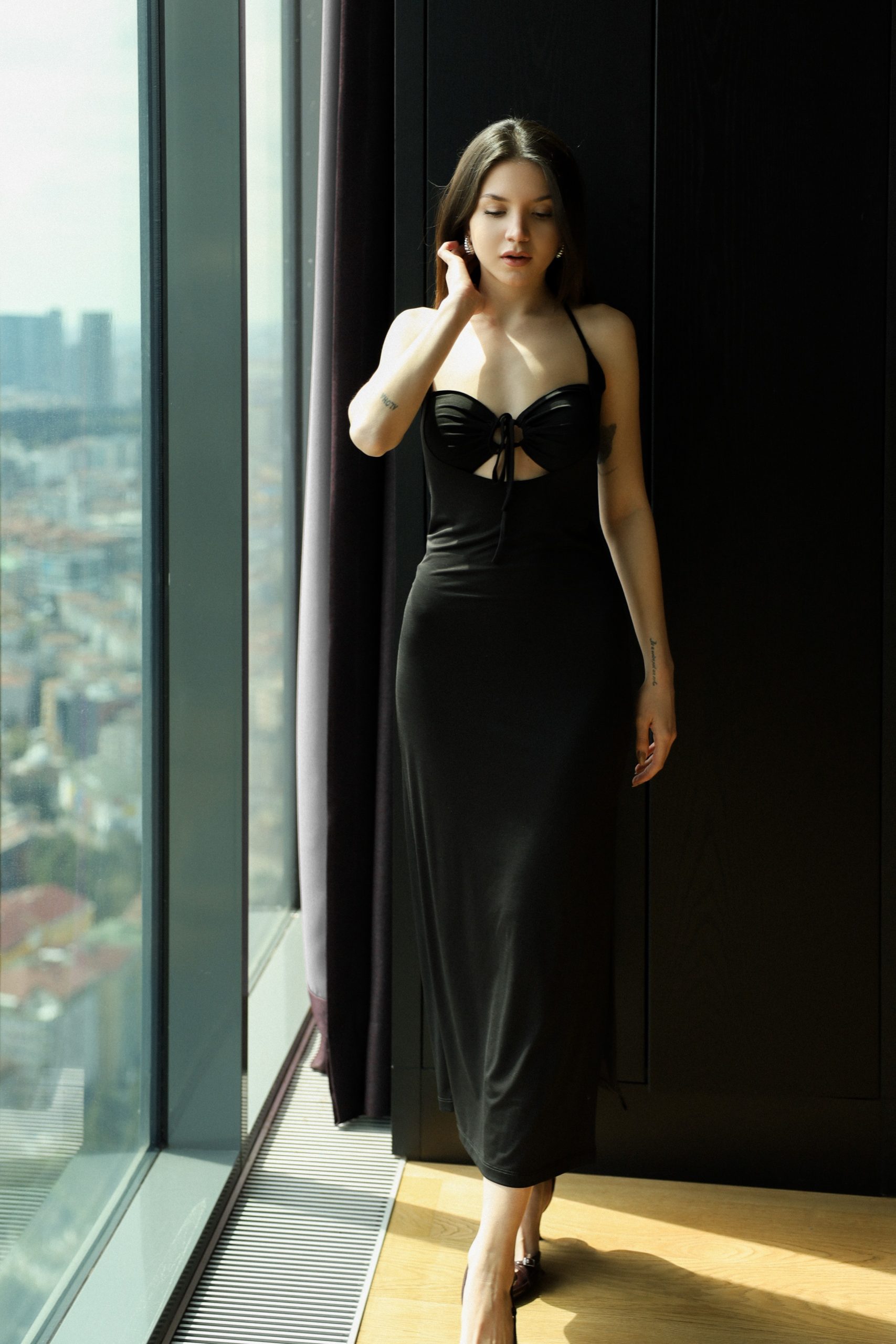Siyah boyundan bağcıklı uzun elbise, her ortama uyum sağlar.