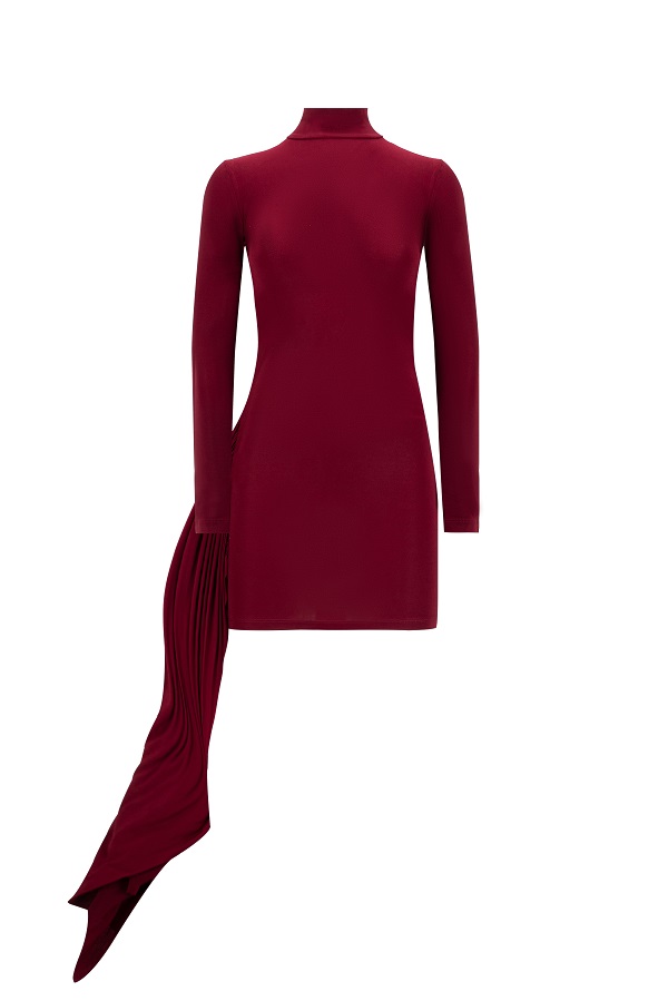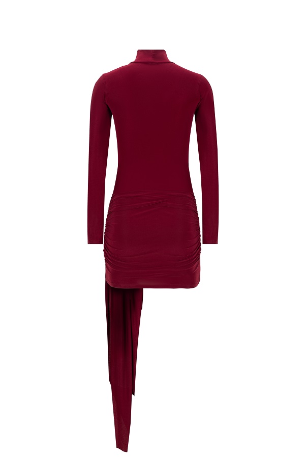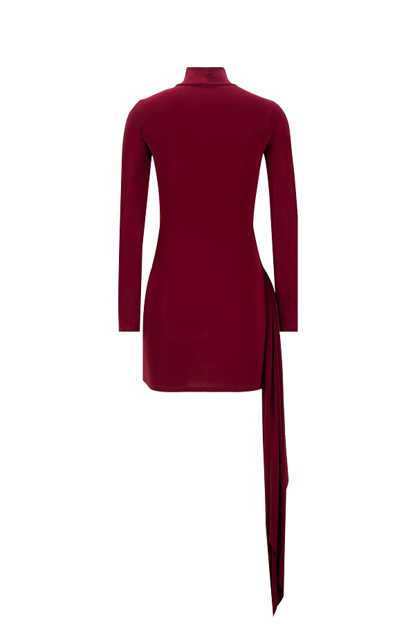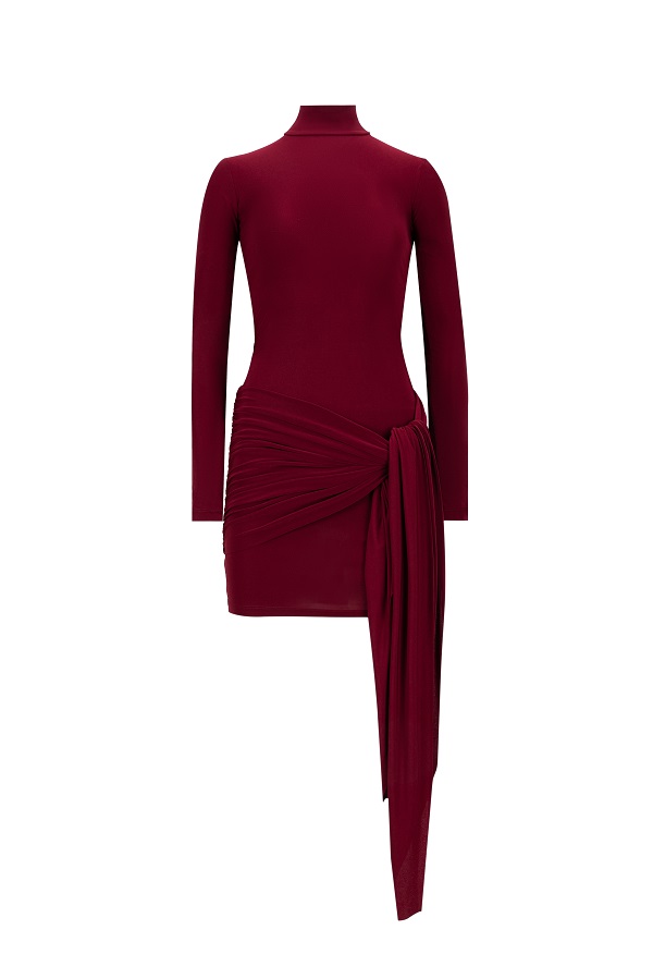 Bordo kısa elbise, uzun kollu ve balıkçı yaka detayları ile şıklığı tamamlar.